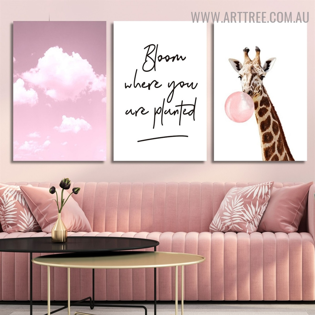 Adorn your walls with this whimsical 3-panel canvas set, featuring a captivating blend of nature and modern art. A majestic giraffe stands against a stunning pink and white sky, complemented by the uplifting "Bloom Where You Are Planted" typography. This ready-to-hang, gallery-wrapped artwork brings a playful yet inspiring vibe to your space, perfect for adding a touch of personality and charm.