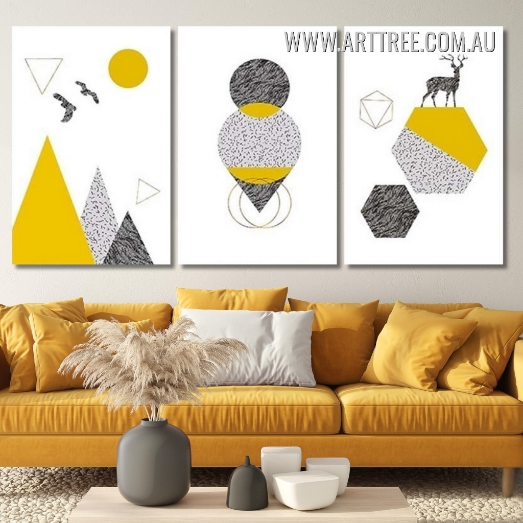 Transform your space with this Nordic-inspired three-piece canvas set, blending geometric precision with organic wildlife. Featuring minimalist deer, soaring birds, and a mix of splotches and hexagons, these abstract panels create a balanced, modern aesthetic. Each piece comes professionally gallery-wrapped and framed, providing a sophisticated, ready-to-hang focal point for any contemporary Australian home or office.