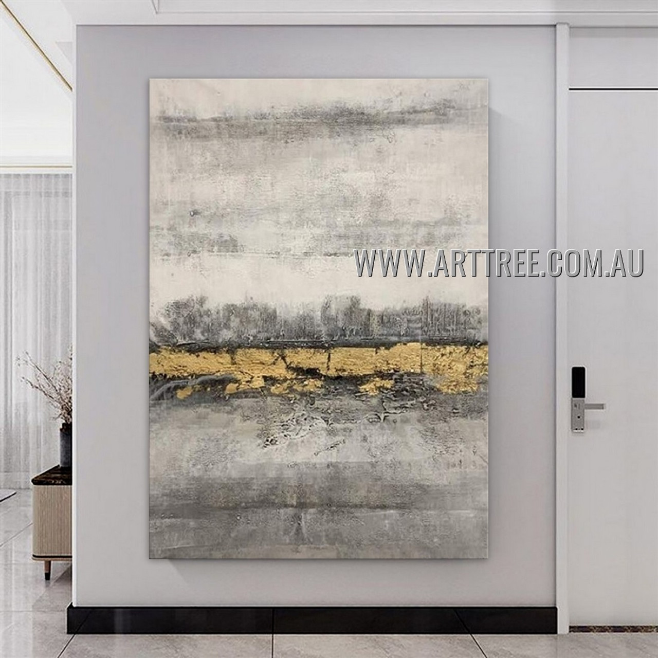 Rich golden strokes create a striking, stained design against a muted grey background. This contemporary abstract painting is defined by its thick, heavy texture, meticulously crafted by hand to add a tactile dimension. A sophisticated and elegant statement piece, this unique, framed artwork is now available for sale in Hobart.