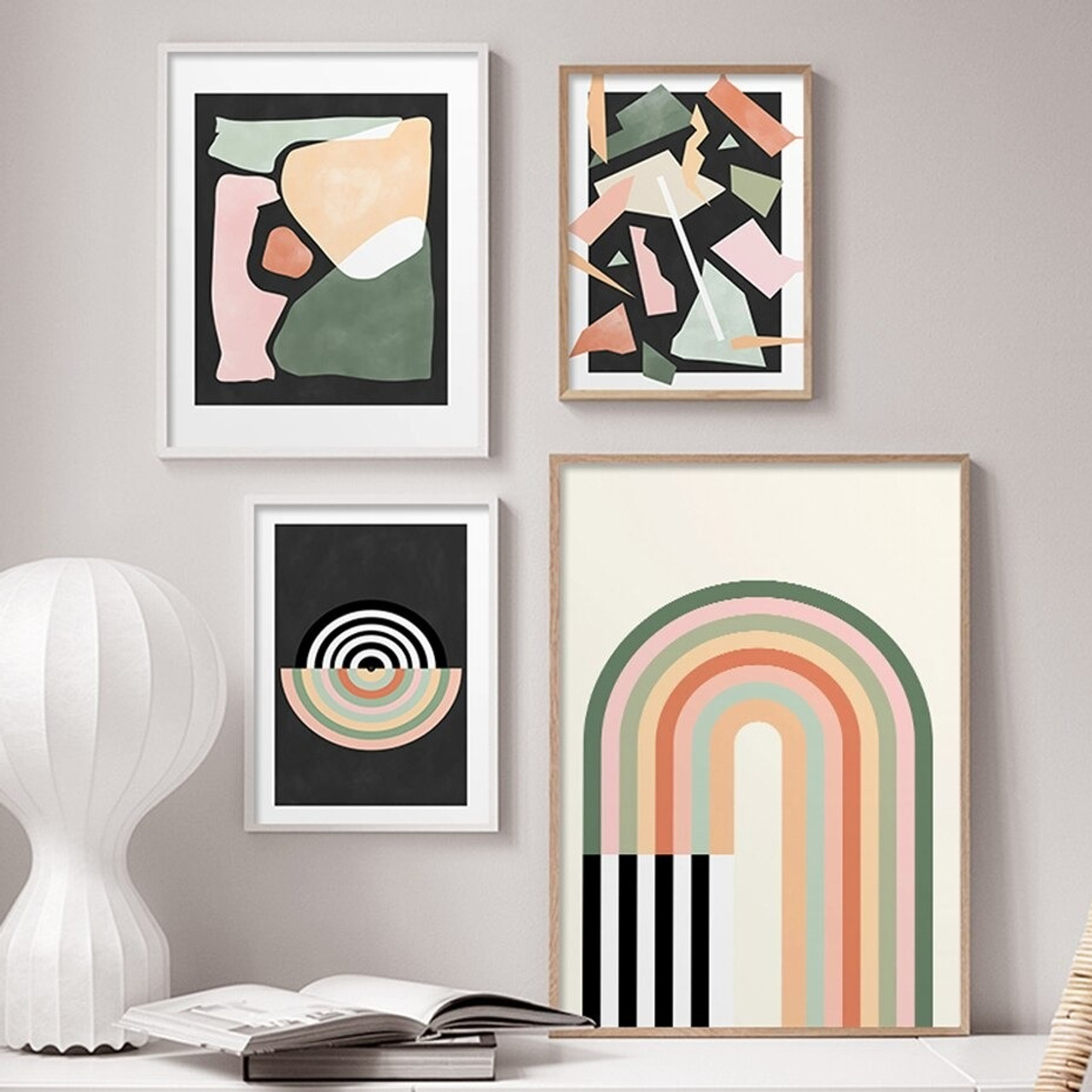 Liven up your home with this set of 4 vintage canvas prints featuring a dynamic abstract design. The artwork showcases bold, chromatic color shade spots combined with geometrical elements like rectangles, curved lines, and semi-circles. This affordable, multi-panel wall art provides a vibrant and modern focal point for your décor.