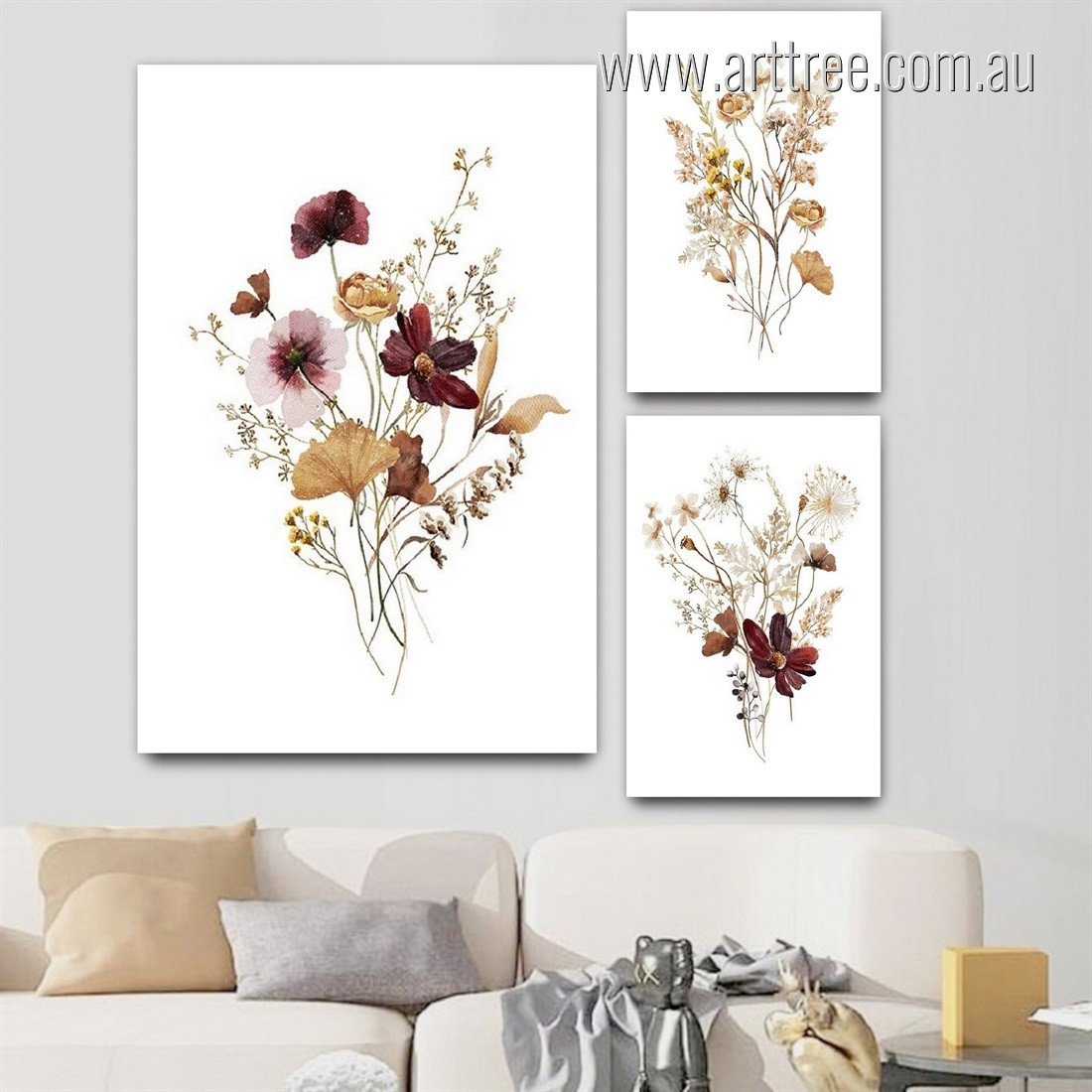 Delicate wildflowers and elegant leaves create a serene, minimalist design in this three-panel canvas set. Inspired by bohemian and Scandinavian styles, this gallery-wrapped artwork brings a calming, natural aesthetic to your bedroom. This affordable wall decor offers a sophisticated and peaceful touch, perfect for creating a relaxed and stylish atmosphere.